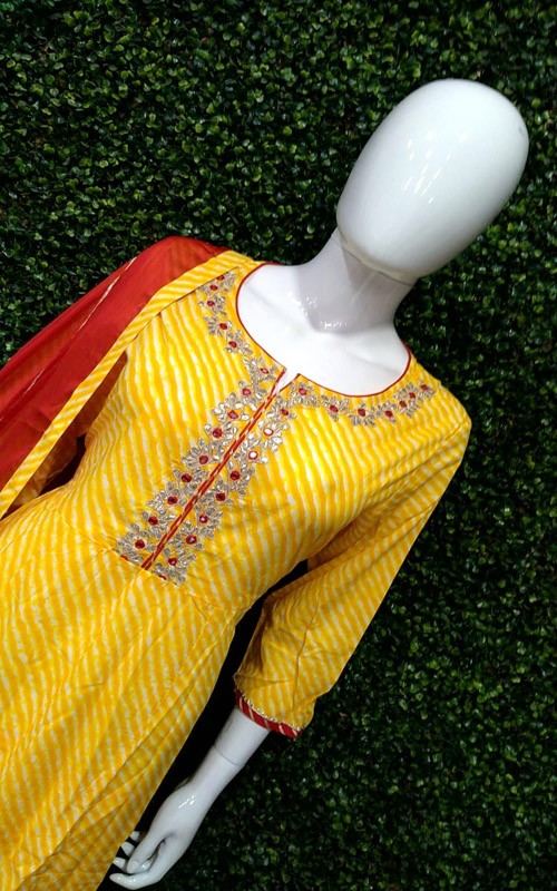 Lehria Print Cotton Anarkali with pant and contrast dupatta